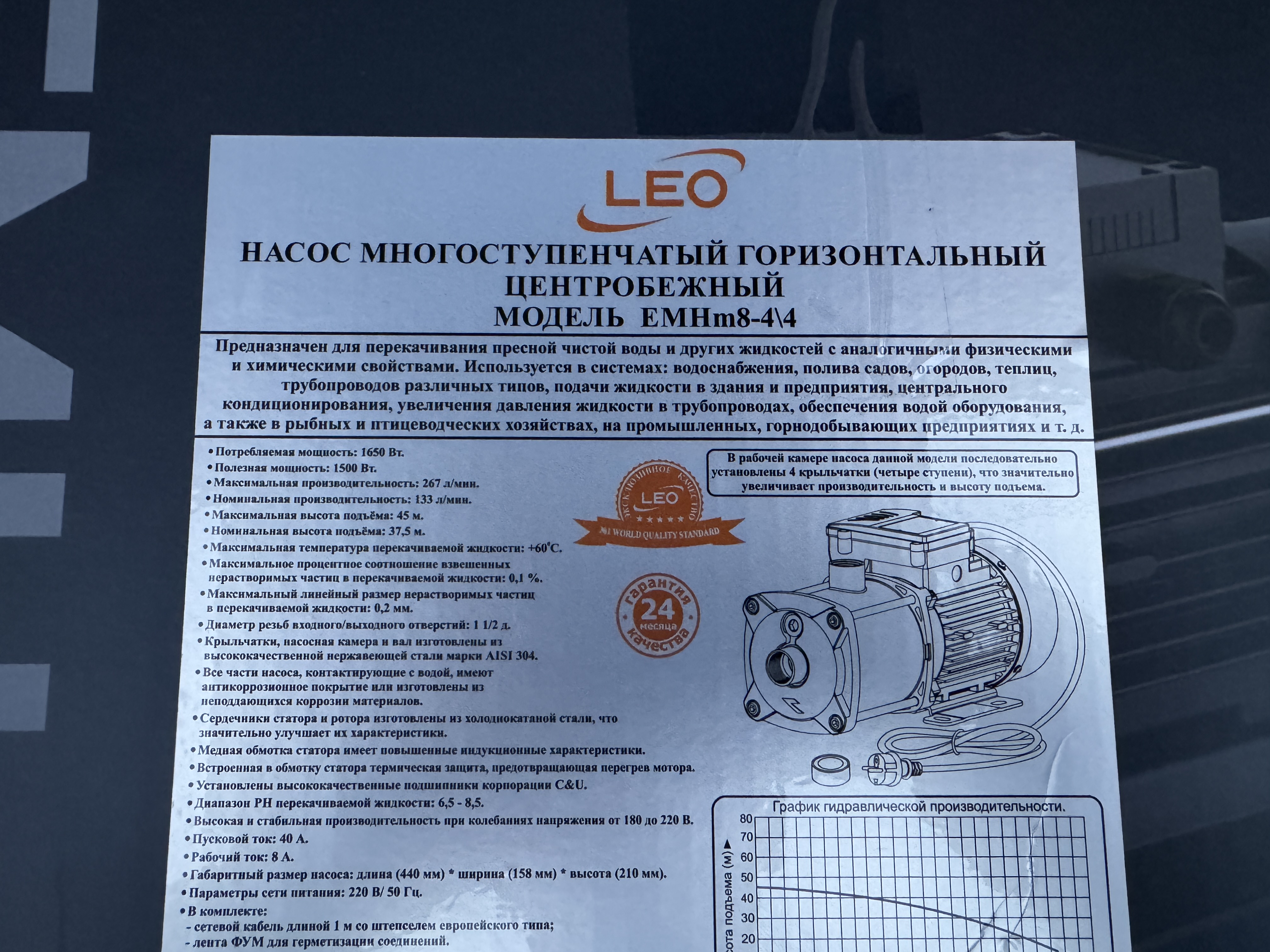 | Насос многоступенчатый горизонтальный центробежный "LEO" модель EMHm8-4/4 | |